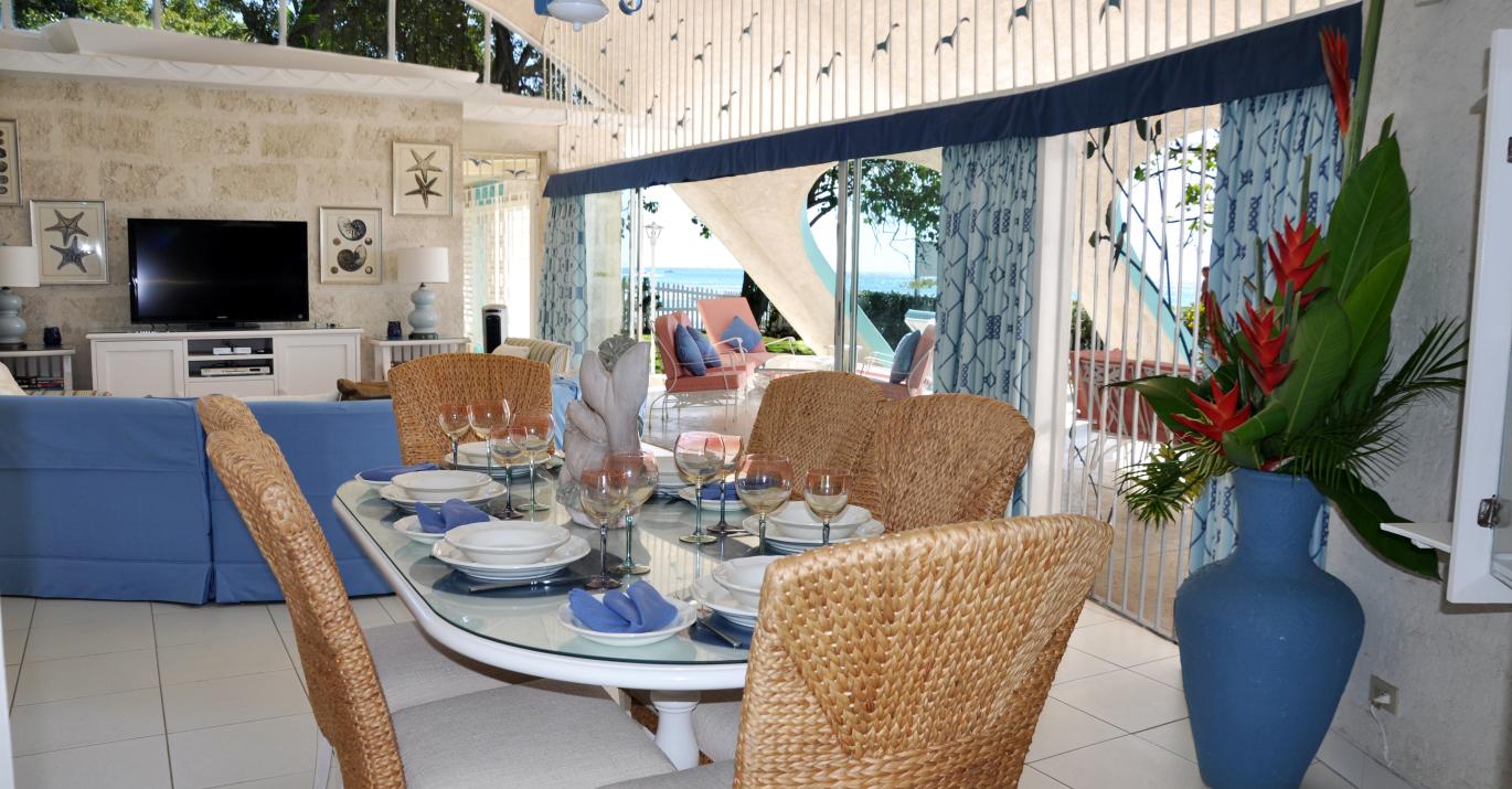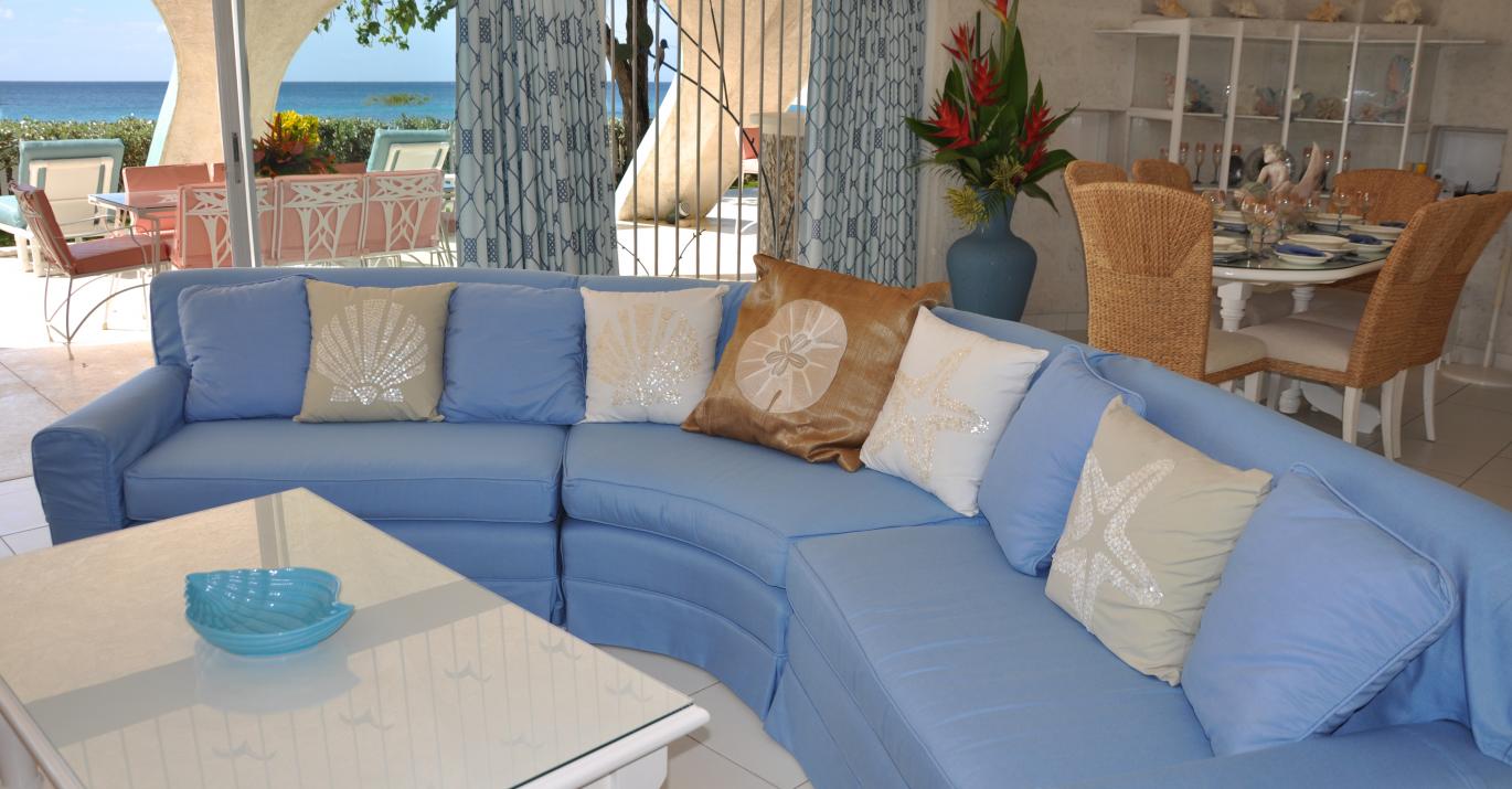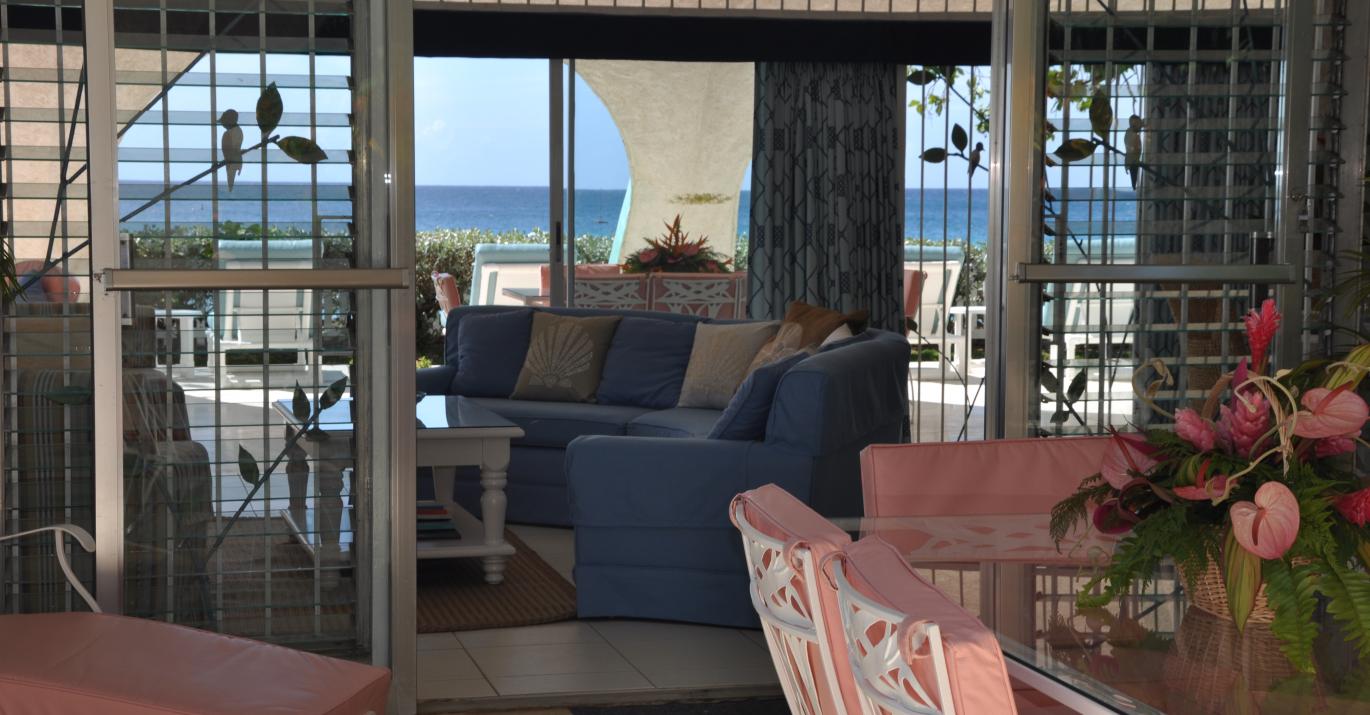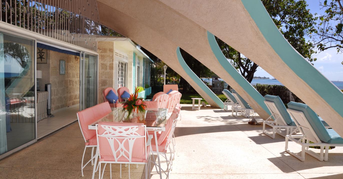 Bali H'ai is a unique beachfront villa located on the west coast of Barbados. Shaded away in a grove of Mahogany trees and overlooking the beautiful calm waters of the Caribbean sea, This recently refurbished home is built of coral stone and its uniqueness comes from the extraordinary wave-shaped roof that extends over both front and back patios.
