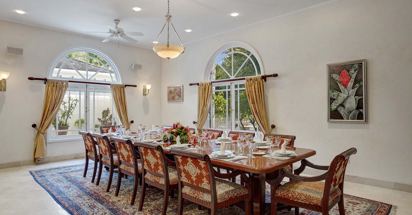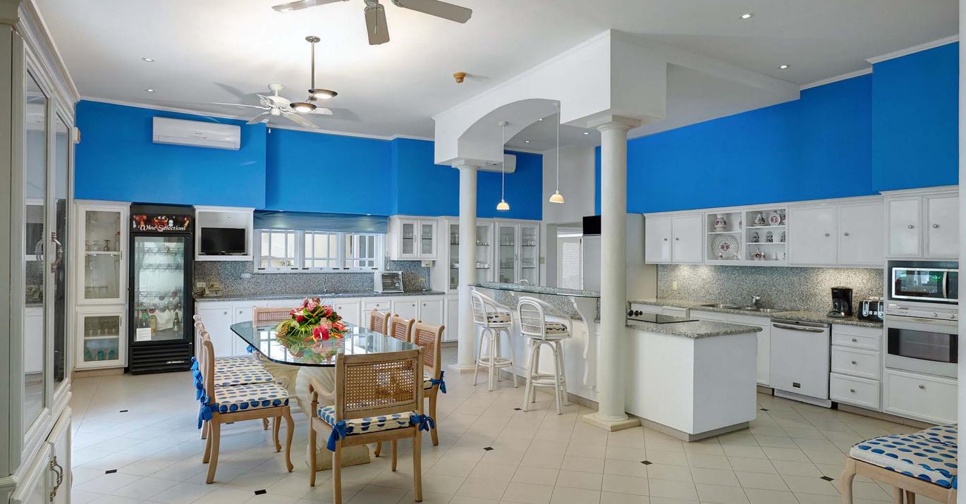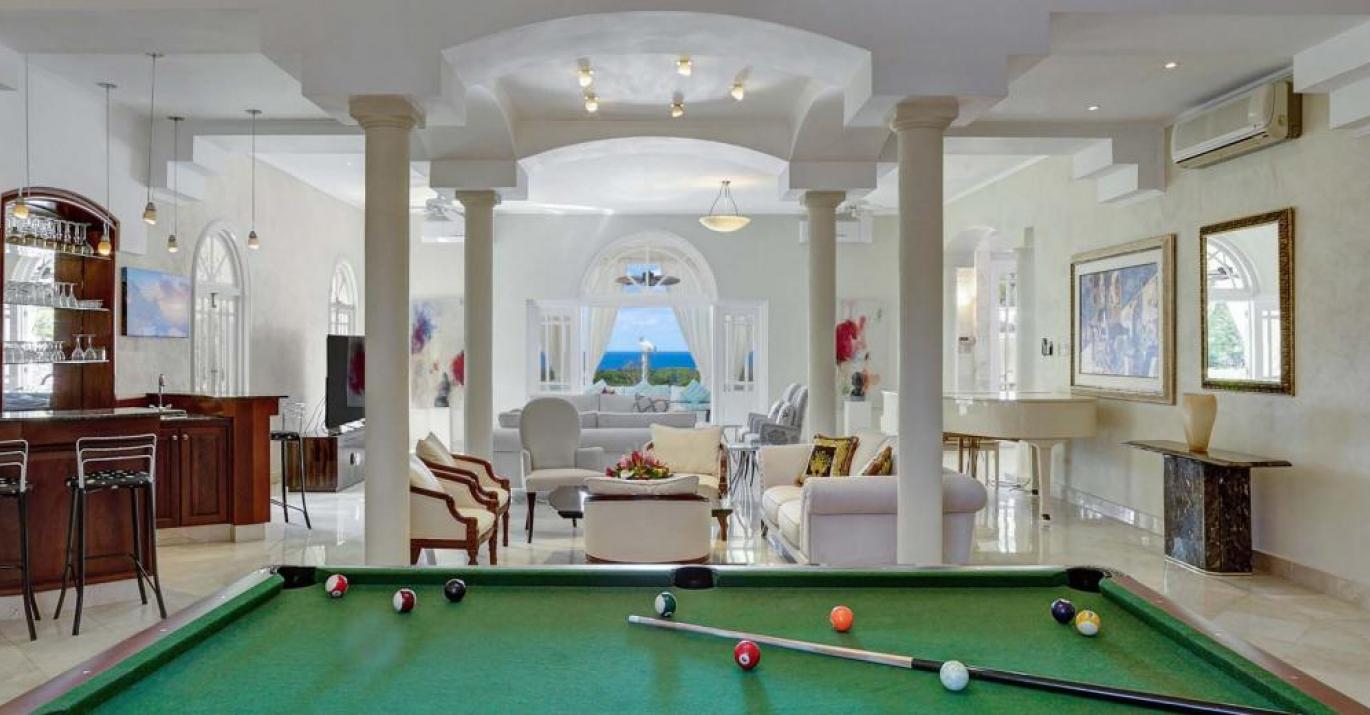 All interiors are grand and spacious with white stone finishings and boutique furniture. The living room features a pool table, bar, plenty of sitting areas, and a Smart TV with the latest viewing technology. The Dining Room boasts a long, mahogany table suitable for lavish dinner parties of 12, while the kitchen area is perfect for everyday meals.