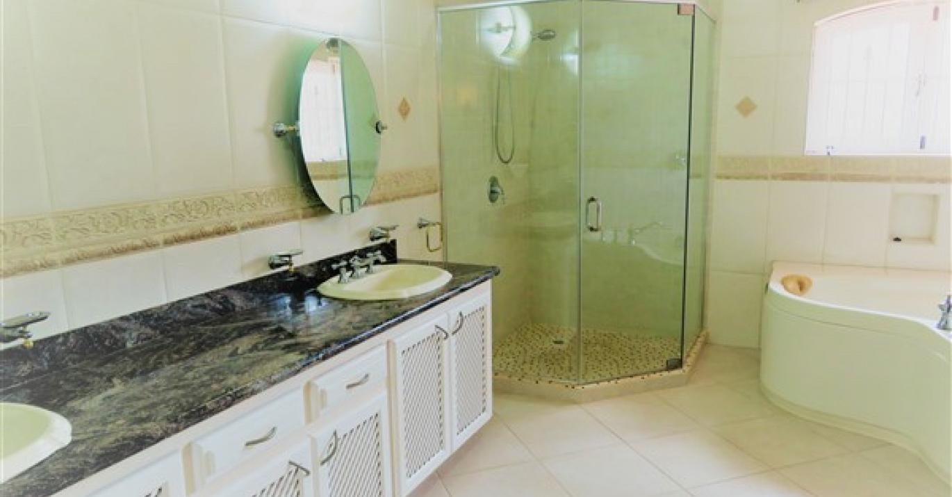 Entering via the garage leads through the laundry and pantry area and past a large ensuite bedroom, which is one of two bedrooms on the lower level. The kitchen is well equipped with all of the necessary appliances, granite countertops, and opens on one side to a formal dining area and a breakfast area on the other side. At the far end is a living room. From the dining room is the entrance foyer and a half bathroom. Heading away from the living room is another bathroom and the second downstairs bedroom. The downstairs boasts a covered veranda with a bar, looking out to the pool. Going up the wood stairs with beautiful coral rendering at the top leads to the master bedroom and two others. The master has two balconies, an oversized walk-in closet and bathroom. All bedrooms are spacious, with ensuite bathrooms, large closets and AC units.