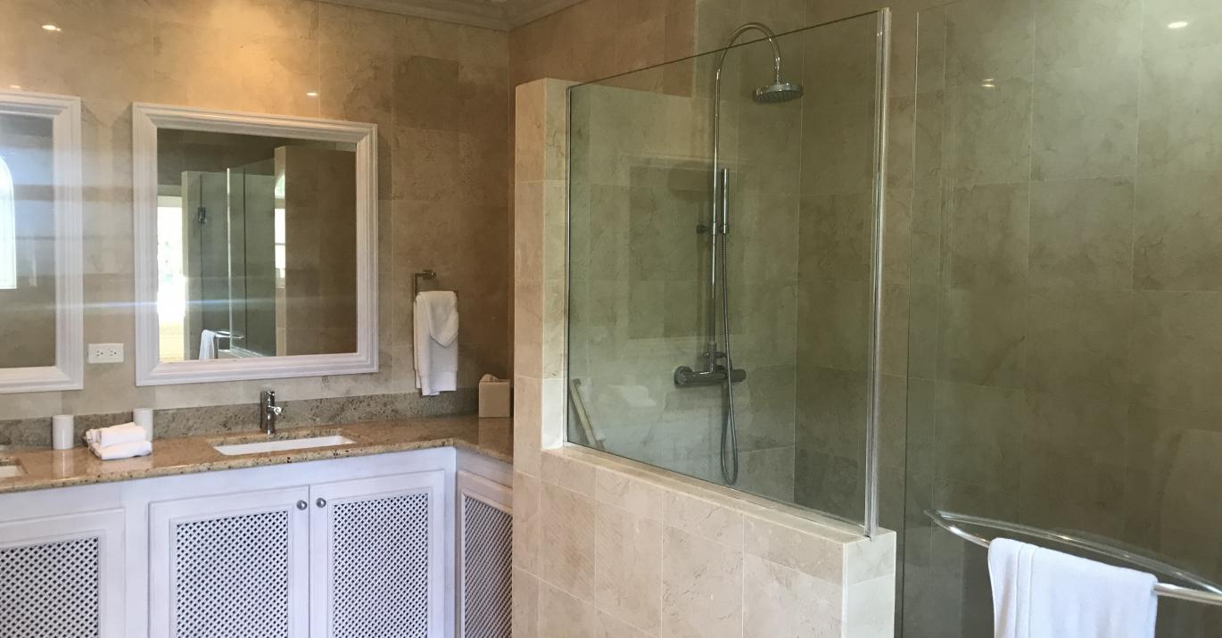 With a popular ‘reverse living’ design, the villa is setup with the open plan living, dining and kitchen areas on the upper level, taking full advantage of natural light and breezes and opening on to a beautiful patio. The 5th bedroom – which could double as convenient little nook/study – is also on this level. The master bedroom and one guest room are on the lower level and both lead on to a covered terrace and to the pool deck beyond. The spacious master room is en-suite with a fantastic walk in closet.