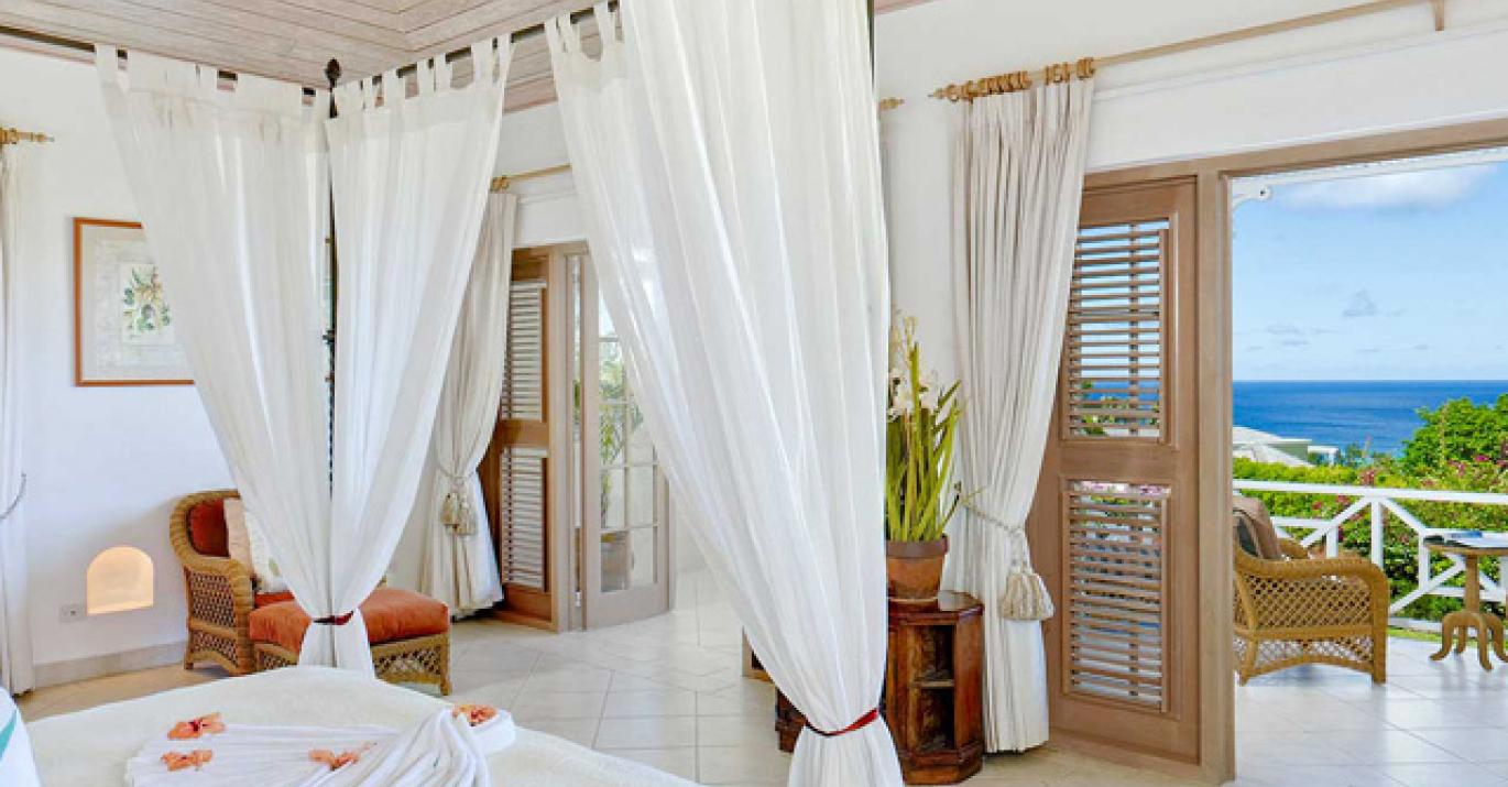 The tower, reminiscent of a medieval bell-tower, is a feature of the house with its high vaulted ceiling and ornate windows. At the top of the stairs you enter the Master Bedroom Suite, with superking size four poster bed and separate dressing room. The ensuite bathroom has a large corner bath tub, a separate shower and twin basins. Running the length of the Master Suite and approached through two sets of French windows is its private veranda, offering truly spectacular westerly views of the Caribbean Sea.