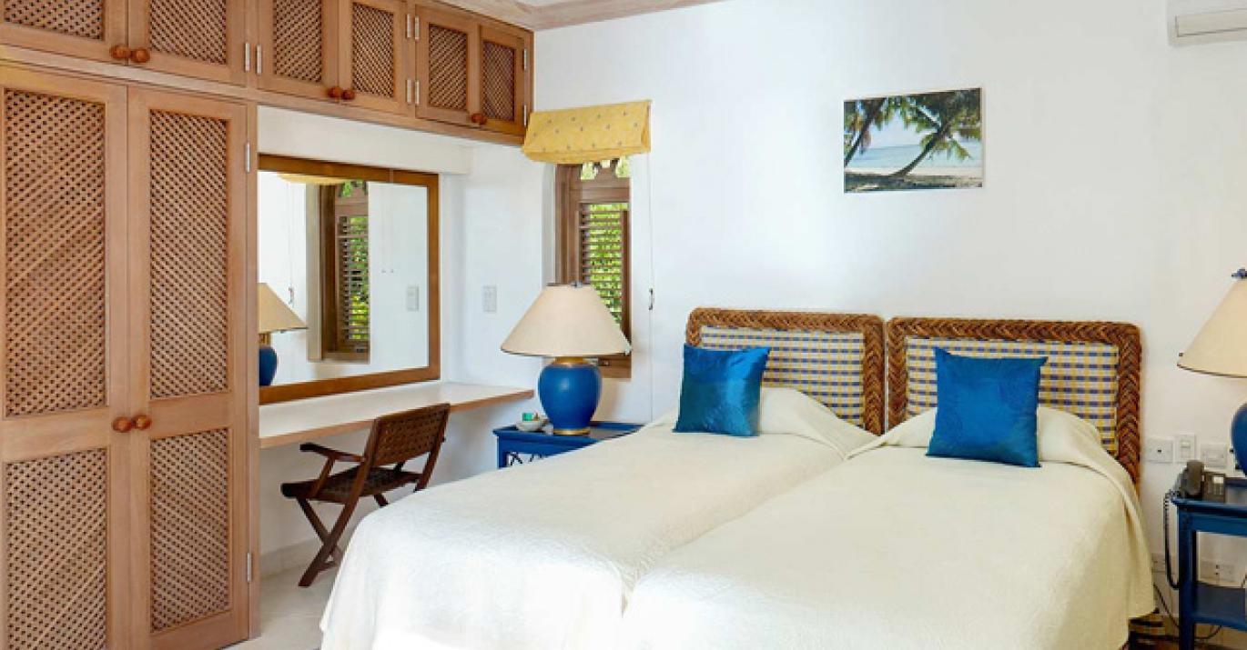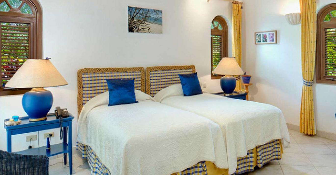 The living room opens out onto the expansive covered terrace through two sets of French windows. Beyond is the large pool deck, the gardens and the azure sea. On the right the hall leads to the lower bedroom wing with its own hallway and door for additional privacy and quietness. Across the hall is a twin bedroom, where the beds can also be arranged as a kingsize, with a private patio. At the end of the hallway is the Queen Bedroom Suite, with sitting area, which opens through French windows onto both the pool deck and the covered terrace.