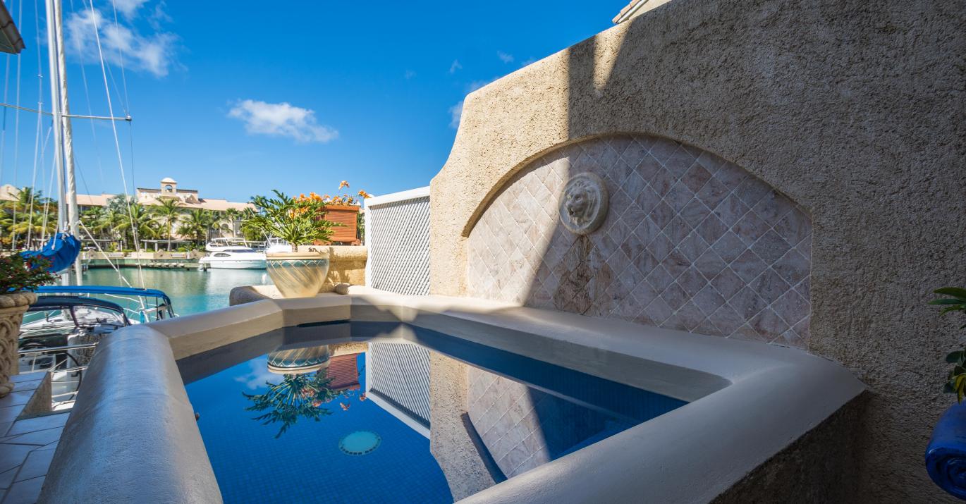 Overlooking the water, a partially covered terrace hosts an enchanting dining area and intimate plunge pool. From the terrace one steps onto the private dock and pier.