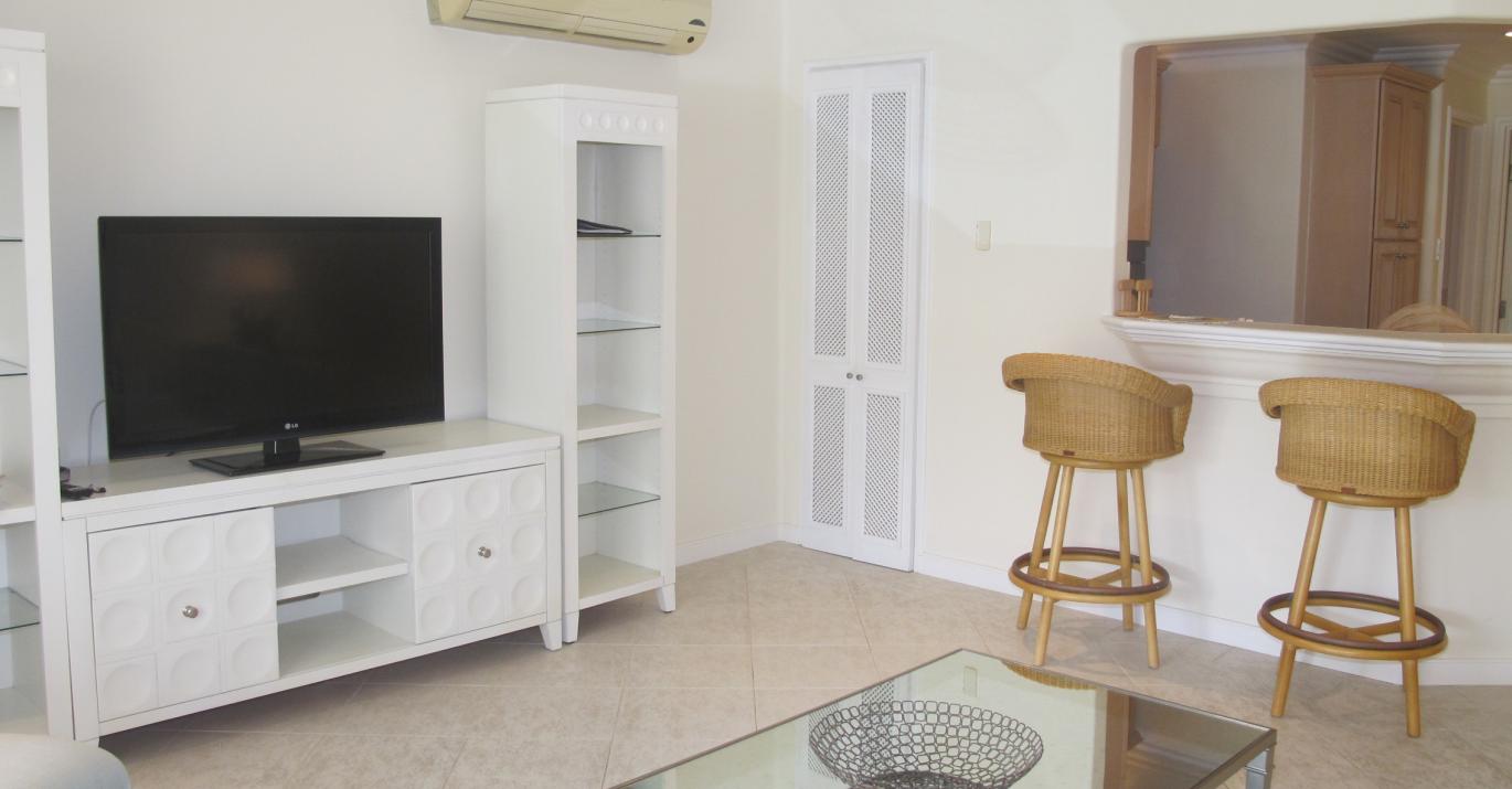 The spacious bedroom is beautifully decorated, with a large air-conditioned bathroom tiled in marble. Residents enjoy the choice of air-conditioning, ceiling fans or the cooling trade winds.