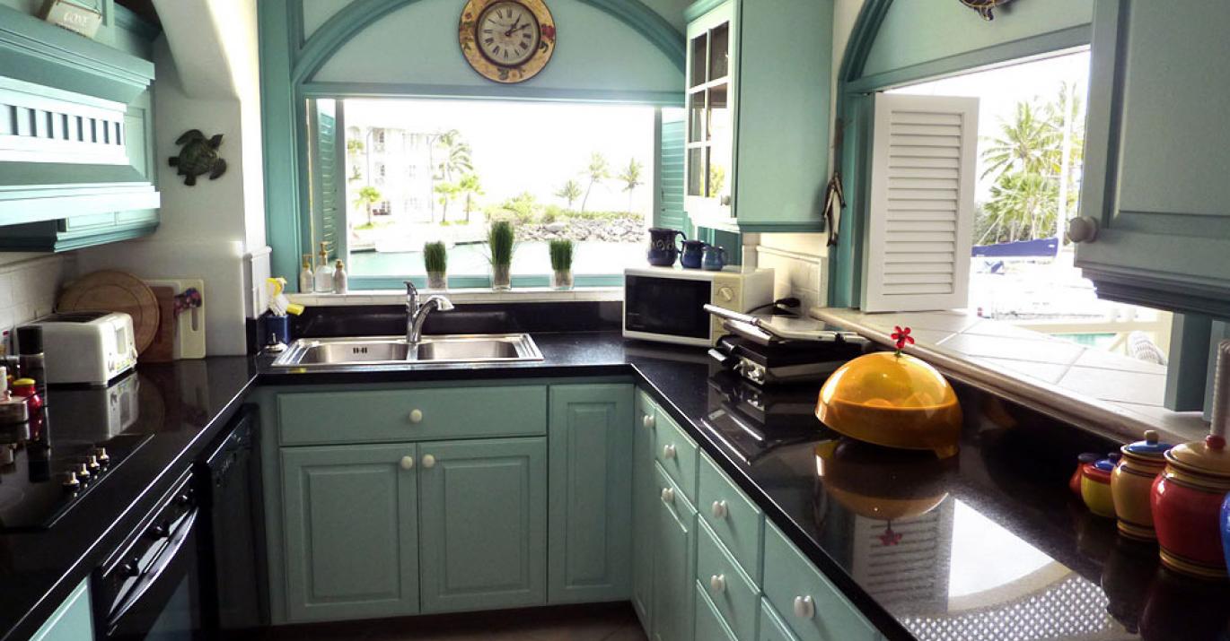 The spacious kitchen looks on to both the terrace and the sparkling lagoon. Two guest bedrooms, each with en suite marbled bathrooms.