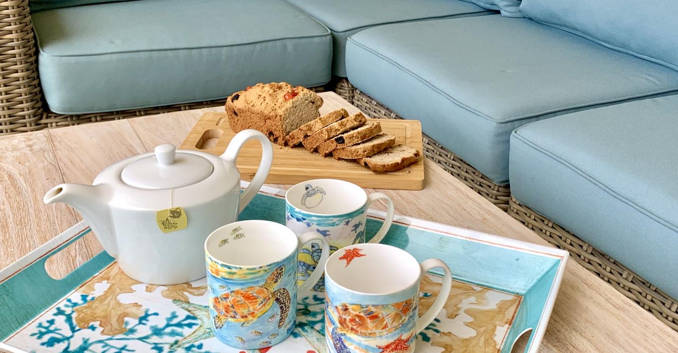 The queen master bedroom enjoys a nautical theme with calming aqua tones and a private balcony with seating for two looking island side. A message on a throw cushion reminds you to “Slow down, we’re on beach time.” This bedroom has an en suite with arty accents and all conveniences.